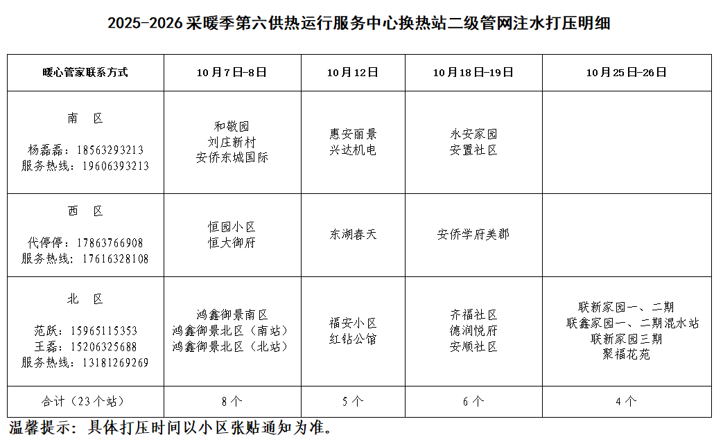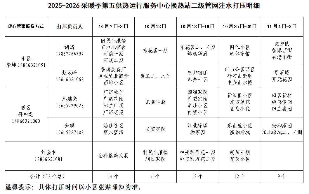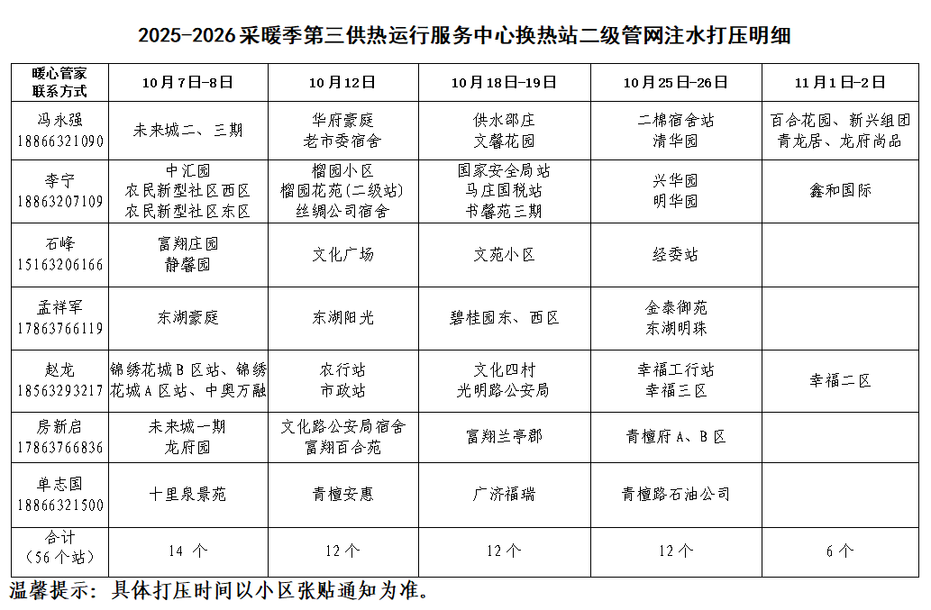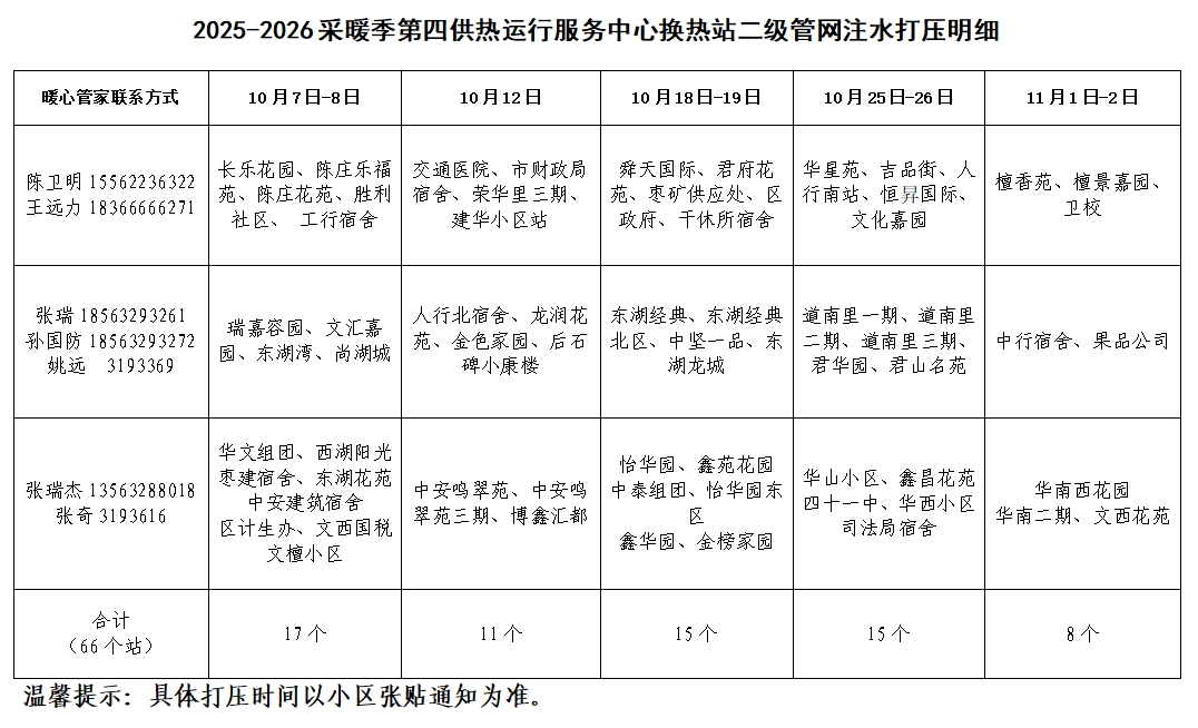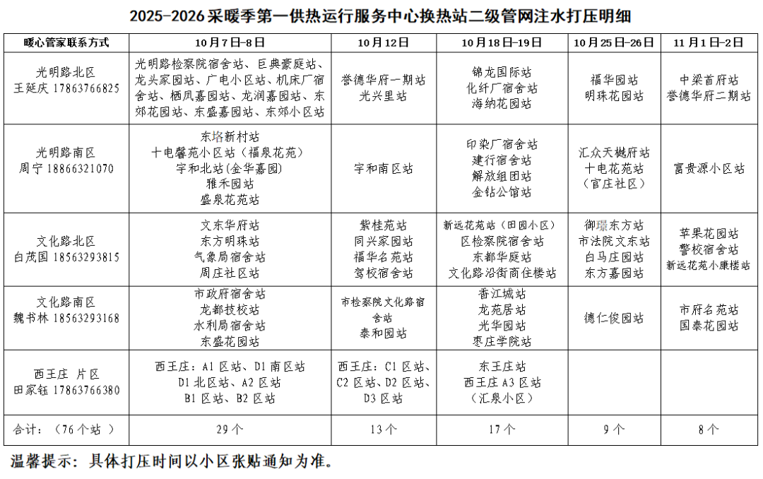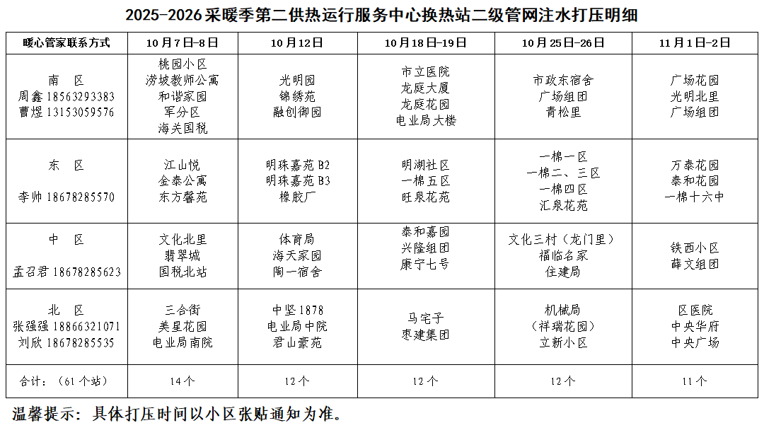 为确保2025—2026年度采暖季正常供热,枣庄市中区热力有限公司计划于10月7日起陆续开启直管区域内二级管网供热系统注水打压工作。届时,请您家中务必留人,为了保证您家庭财产安全,避免因暖气系统跑水而蒙受损失,请您在注水试压期间务必配合做好以下工作: