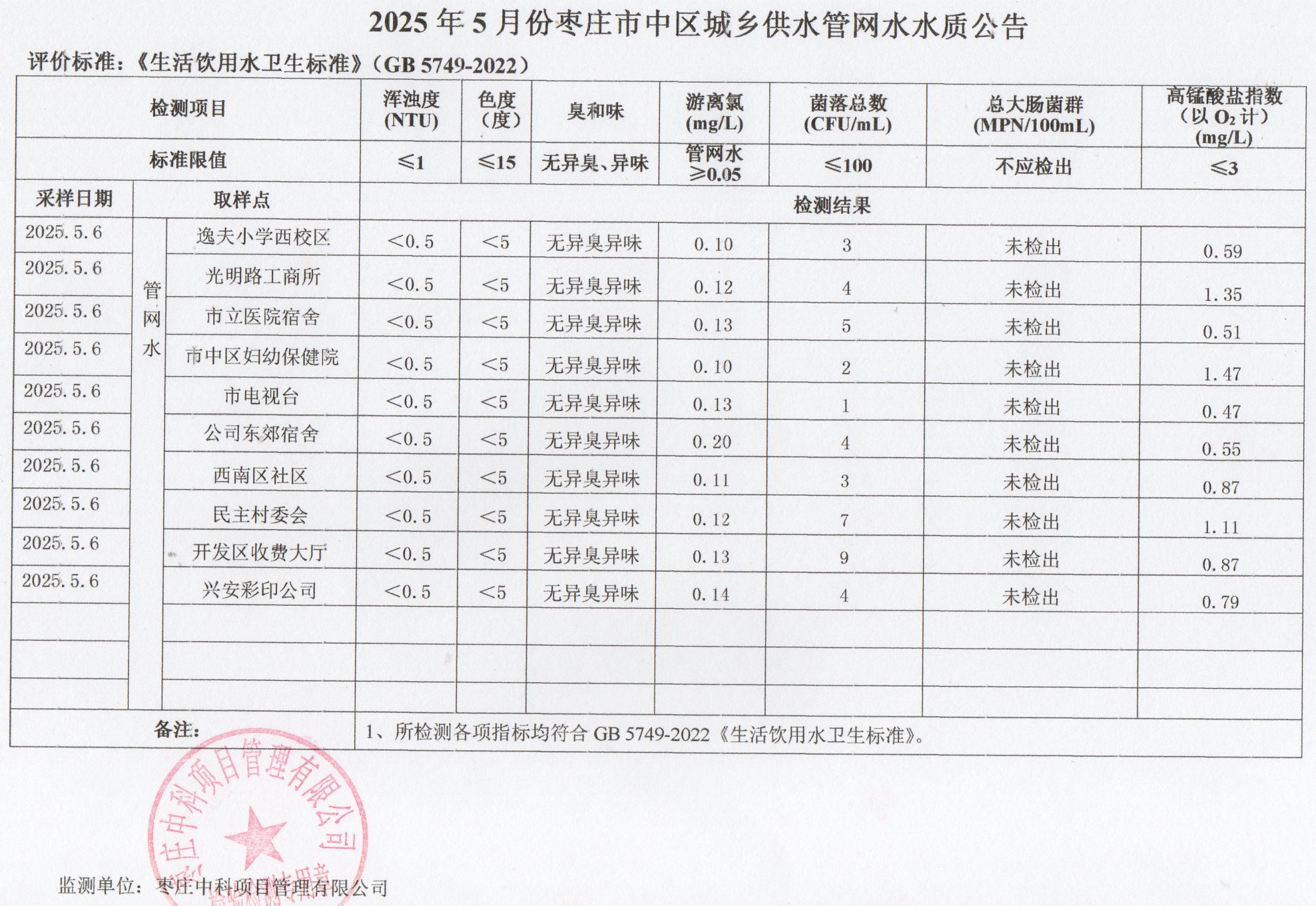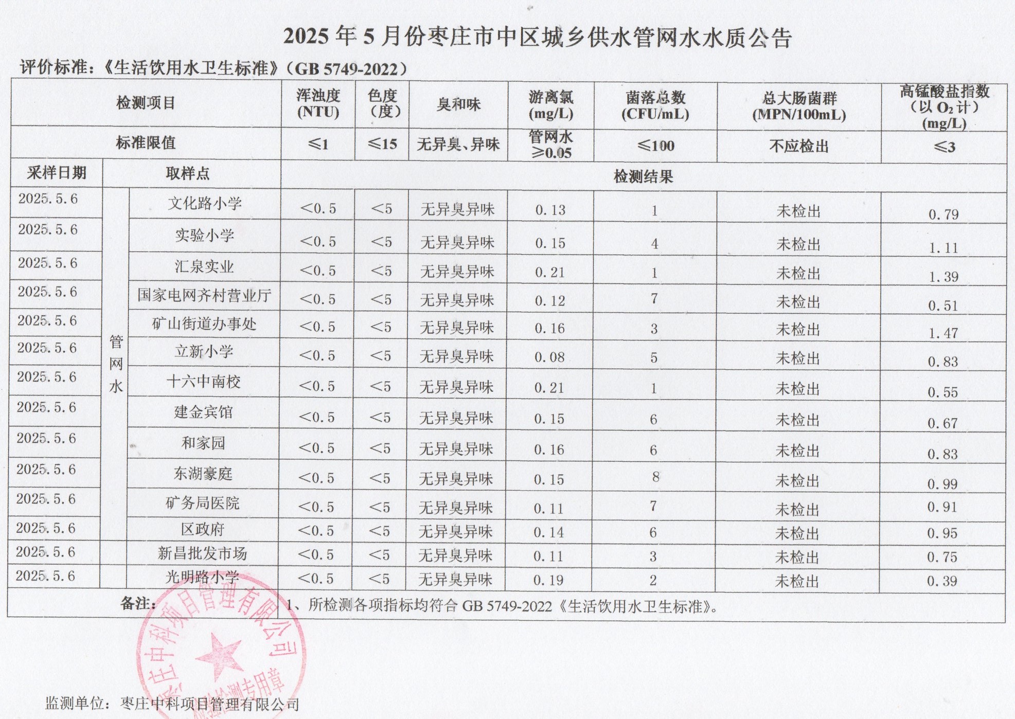 • 标  题:2025年5月份枣庄市中区城乡供水出厂水质公告