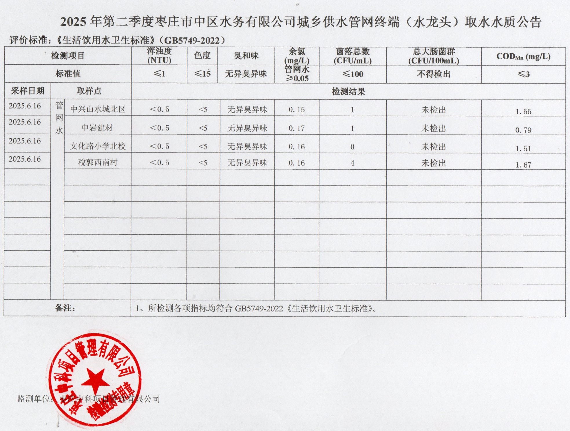 • 标  题:2025年第二季度枣庄市中区水务有限公司城乡供水管网终端(水龙头)取水水质公告
