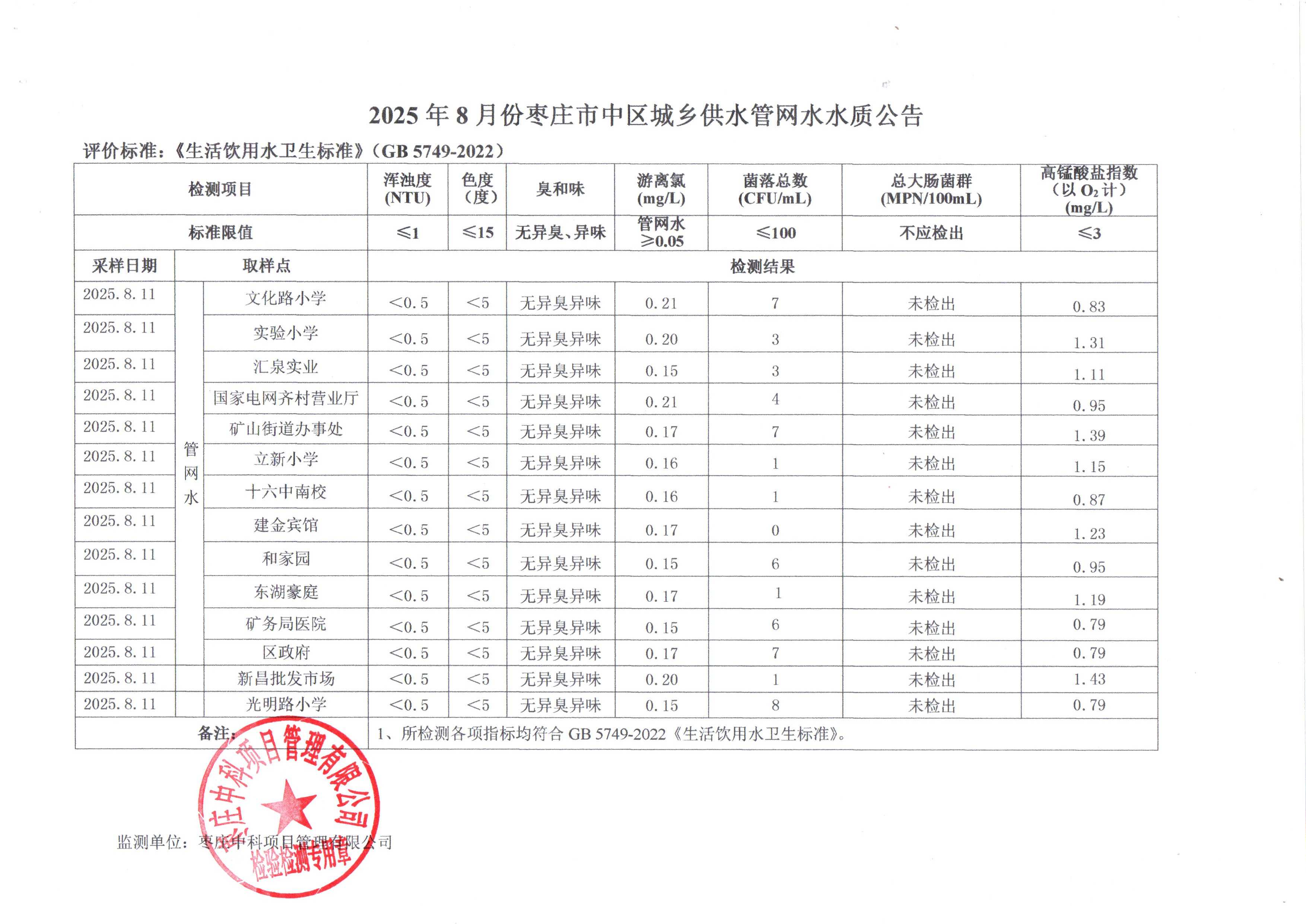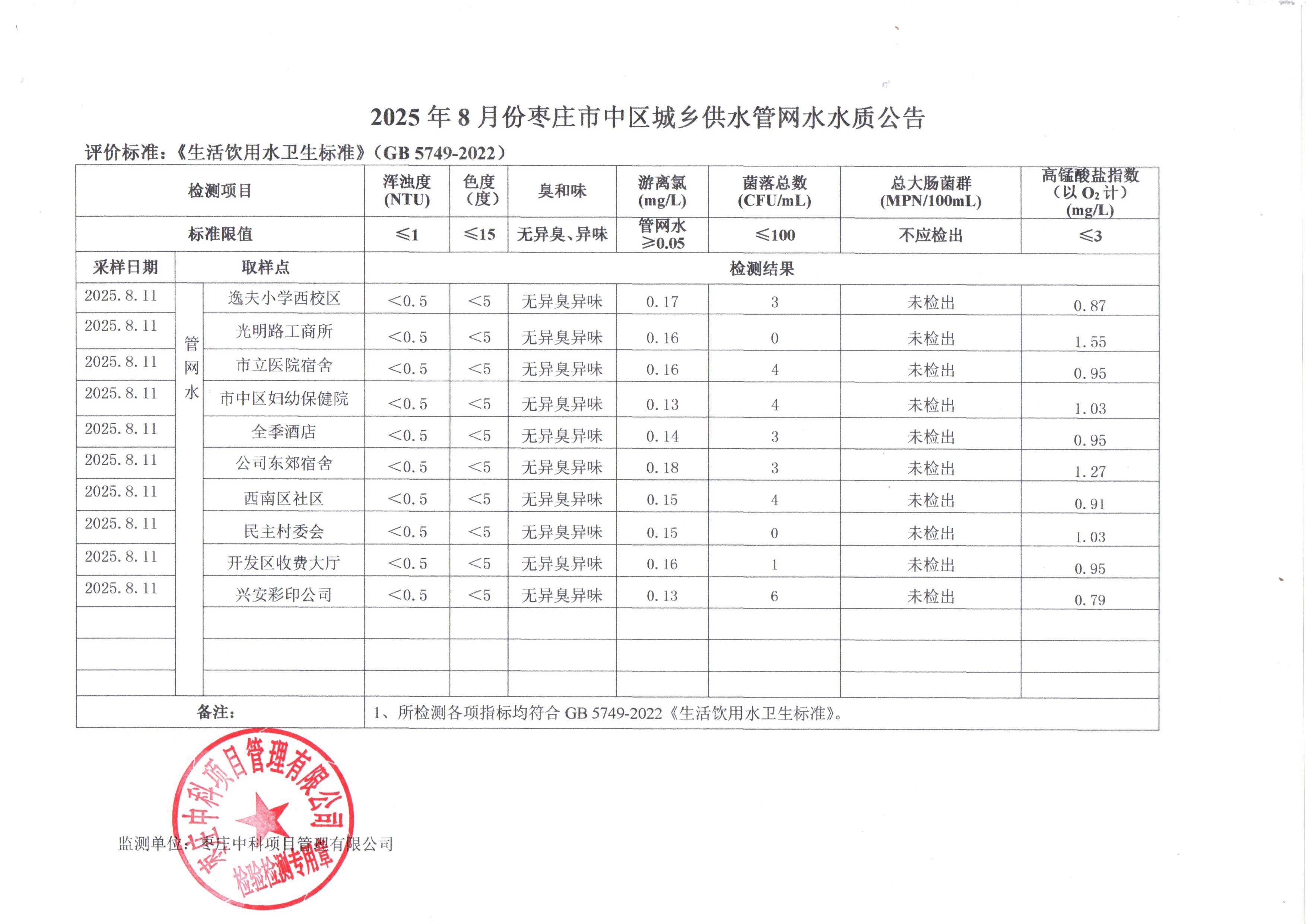 • 标  题:2025年8月份枣庄市中区城乡供水出厂水质公告