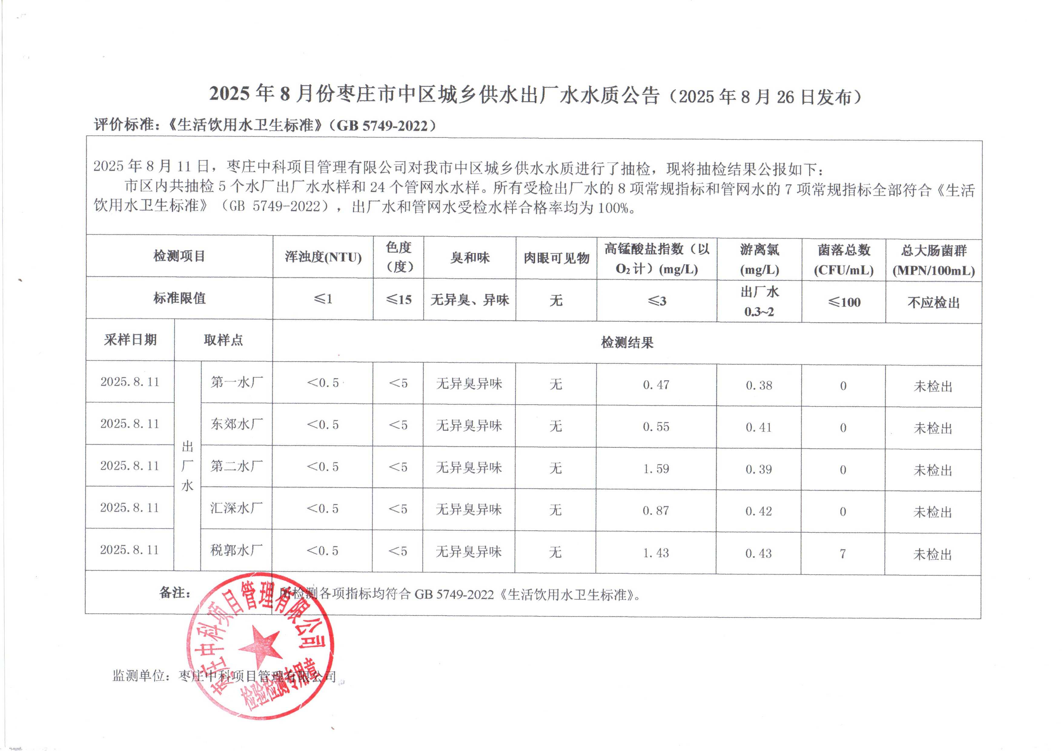 2025年8月份枣庄市中区城乡供水出厂水质公告